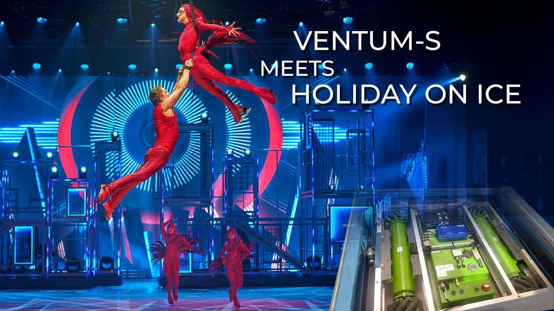 Es traf sich gut, dass HOLIDAY ON ICE kurz vor Weihnachten in Dresden gastierte. Neben der Erwartung der eigentlichen Show hatte das Ganze noch den besonderen Reiz, dass die auf dem Eis fahrenden Konstruktionen mittels unserer Bühnenwagen bewegt wurden.